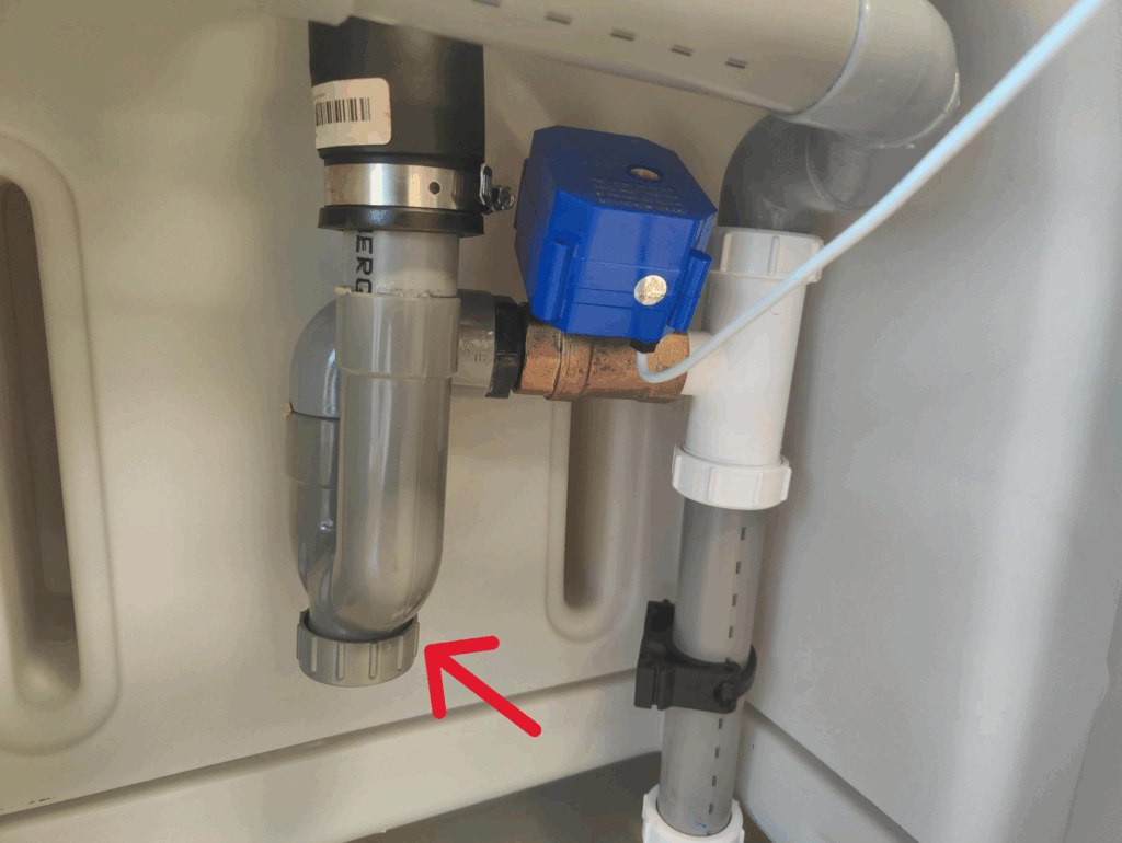 Often after construction or renovation building materials are thrown in the drain. This causes the U-bend PVC piping protecting the T1 waste valve to become clogged (see below picture of the U-bend). Even though the valve is still working. Water is unable to move out of the tank anymore.