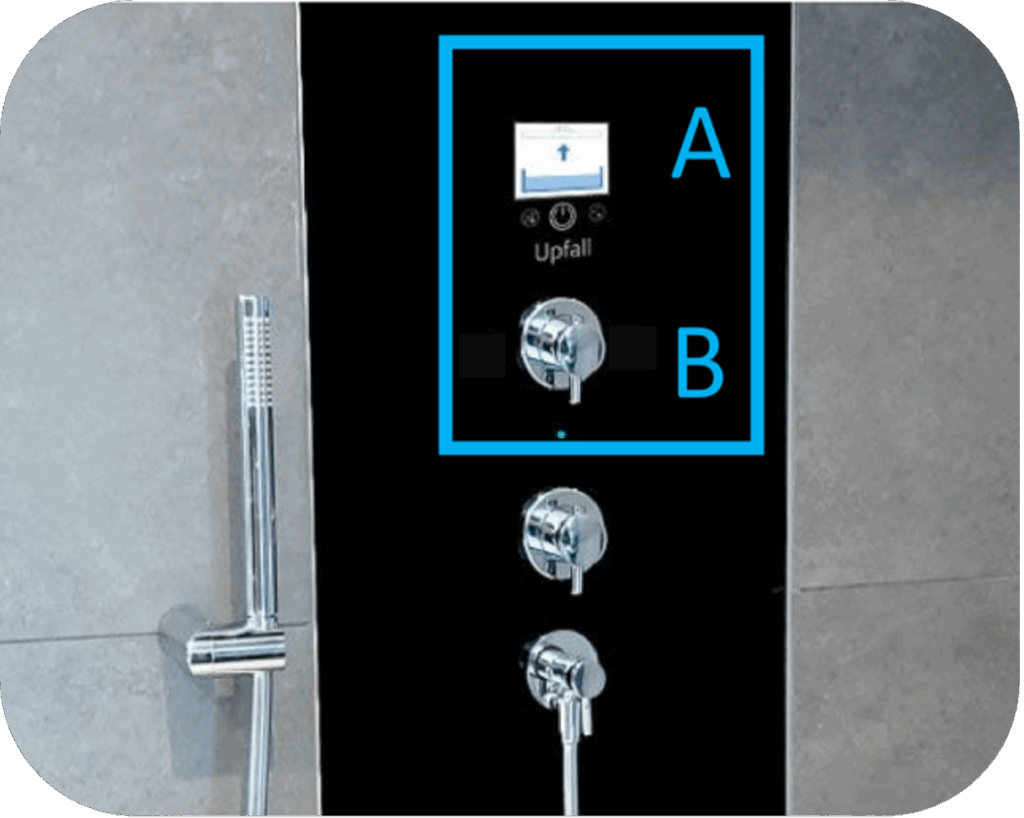 Zodra het reservoir gevuld is, zal het Upfall systeem in werking treden en komt er water uit de hoofddouche. In het venster leest u de actuele temperatuur van het douchewater in stapjes van halve graden.